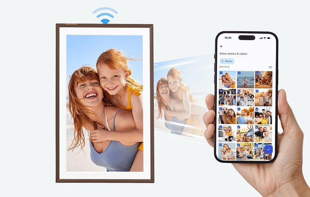 Függőlegesen, vízszintesen? Automatikus forgatás: A keret maga is felismeri a fénykép tájolását, és beállítja a pozícióját - az automatikus elforgatás funkció biztosítja, hogy minden felvétel tökéletesen nézzen ki, akár függőlegesen, akár vízszintesen helyezi el a keretet. Helyezheti polcra, íróasztalra vagy komódra - mindenhol elegánsan fog kinézni.