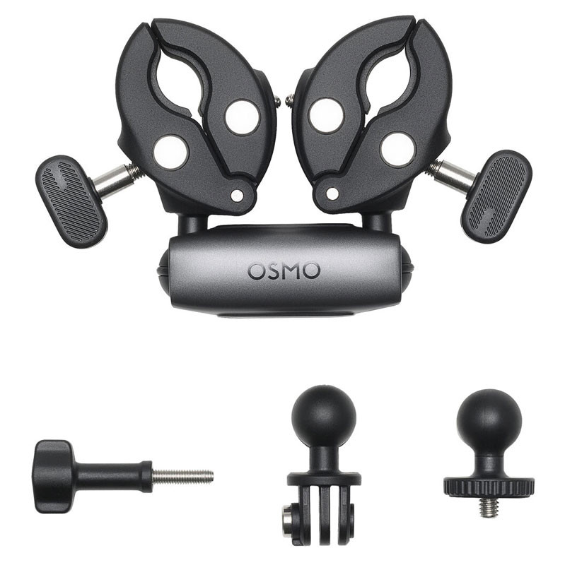 Szerelje fel Osmo Action vagy 360 kameráját egy motorkerékpárra, hogy gyors mozgású POV felvételeket készíthessen a DJI Osmo Dual Heavy-Duty Clamp segítségével. Ez a tartós tartó középső karral rendelkezik, amelynek mindkét végén gömbfejes, nagy teherbírású, rákféle szorítóval ellátott rögzítőelemek találhatók.