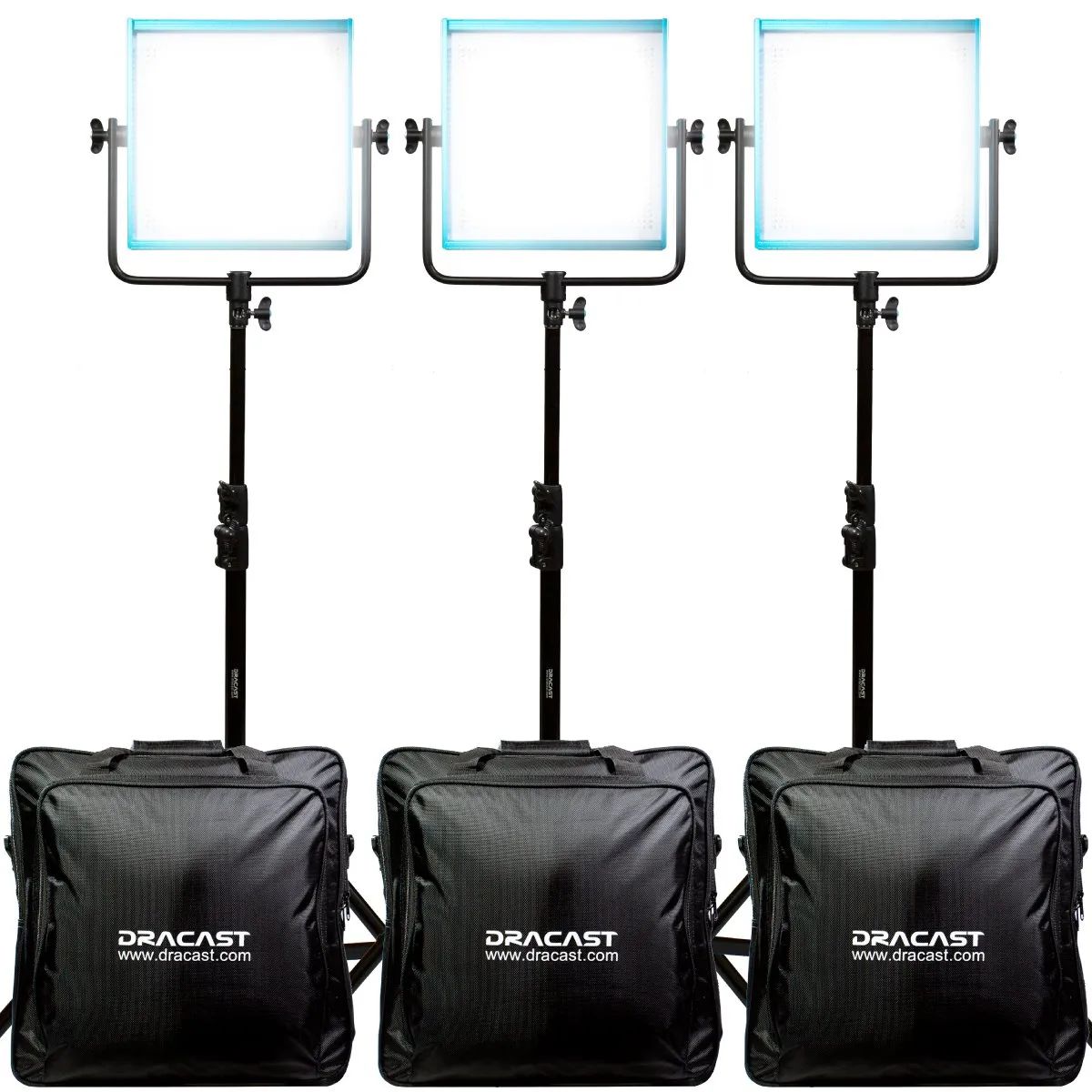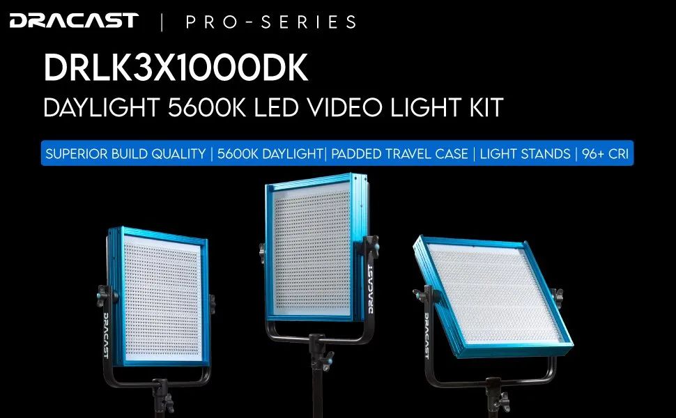 Ez a készlet három (3) Pro Series 1000 LED panelt tartalmaz 5600K nappali színhőmérséklettel. Minden panelhez tartozik egy AC tápegység, egy strapabíró, párnázott utazótáska és egy Dracast DRDLS805 lámpaállvány. A lámpák mindössze 1,8 kg (4,0 lb) súlyúak, így ideálisak helyszíni munkához, interjúkhoz és kisebb szettekhez, ahol a színhűség, a precíz vezérlés és a magas CRI fényteljesítmény kiemelten fontos. Az 5600K nappali színhőmérséklet tökéletesen alkalmas strobeszkópokkal vagy HMI lámpatestekkel való párosításra, valamint a környezeti nappali fényhez való igazításhoz.