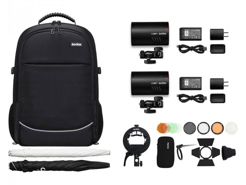 Ez a készlet két AD100Pro zsebvakut, egy AK-R1 tartozékkészletet, egy S2 Speedlite konzolt Bowenshez, egy ezüst esernyőt, egy átlátszó esernyőt és egy CB20 hátizsákot tartalmaz a tároláshoz és szállításhoz.