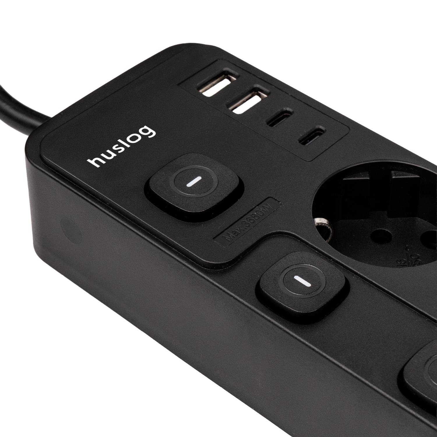 - Huslog hálózati elosztó (4 Schuko aljzattal, 4 USB porttal, 5 kapcsolóval)