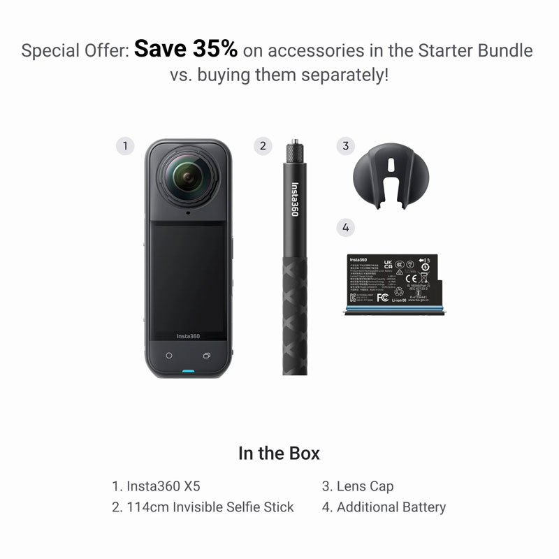 Fejleszd a filmszerű 360°-os videók készítését a nagy teljesítményű Insta360 X5 360° 8K kamerával, amely képes HDR 8K30 360° rögzítésére a PureVideo továbbfejlesztett gyenge fényviszonyok technológiával, kettős vagy egy objektíves üzemmódban, mindezt egyetlen hordozható akciókamerával. Az X5 akcióra kész dizájnt kínál AI-alapú szoftverrel, amely bármilyen környezetben intuitív módon lehetővé teszi a dinamikus tartalom létrehozását, valamint „Bullet Time” rögzítést, 180 Mb/s bitrátát, time shiftet, loop rögzítést és time-lapse funkciót. Az X5 frissített, strapabíró kialakítással is rendelkezik, natívan 15 méterig vízálló, és frissített, 2400 mAh-s újratölthető akkumulátorral rendelkezik, amely akár 88 perces üzemidőt biztosít.
