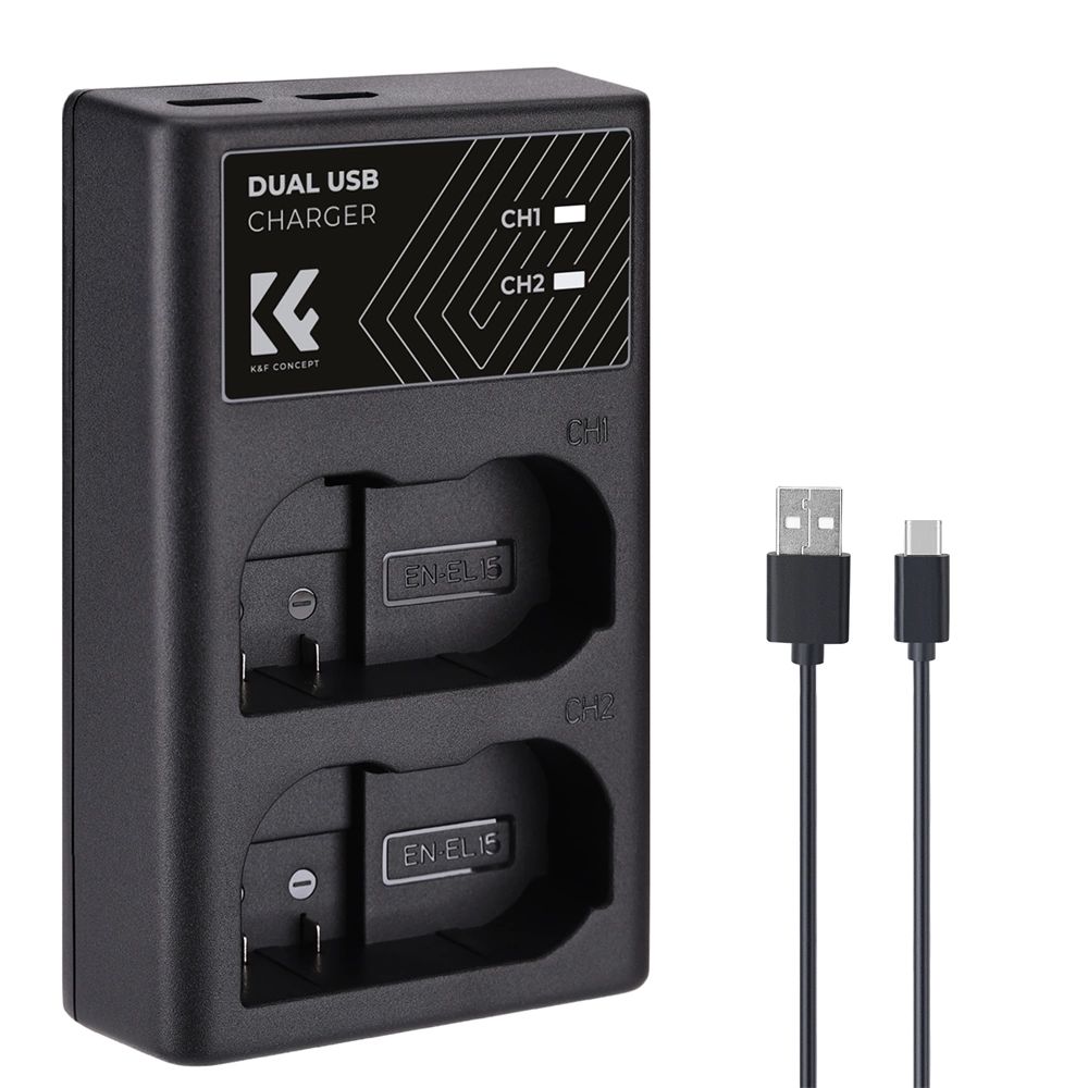 K and F Concept K&F Concept hordozható dupla MH-25 akkumulátor töltő, USB-C, 2db EN-EL15 akkumulátorhoz