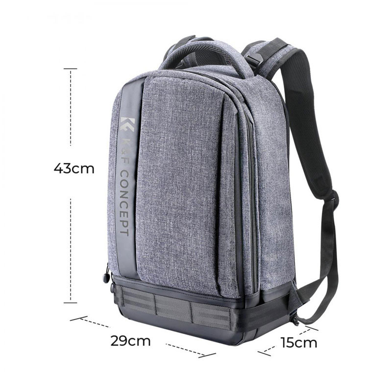 27 x 15 x 43 cm; 2 fényképezőgép + több objektív + laptop + fényképezőgép állvány + kiegészítők tárolására alkalmas; Külön zseb 15,6"-os laptopok szállítására.