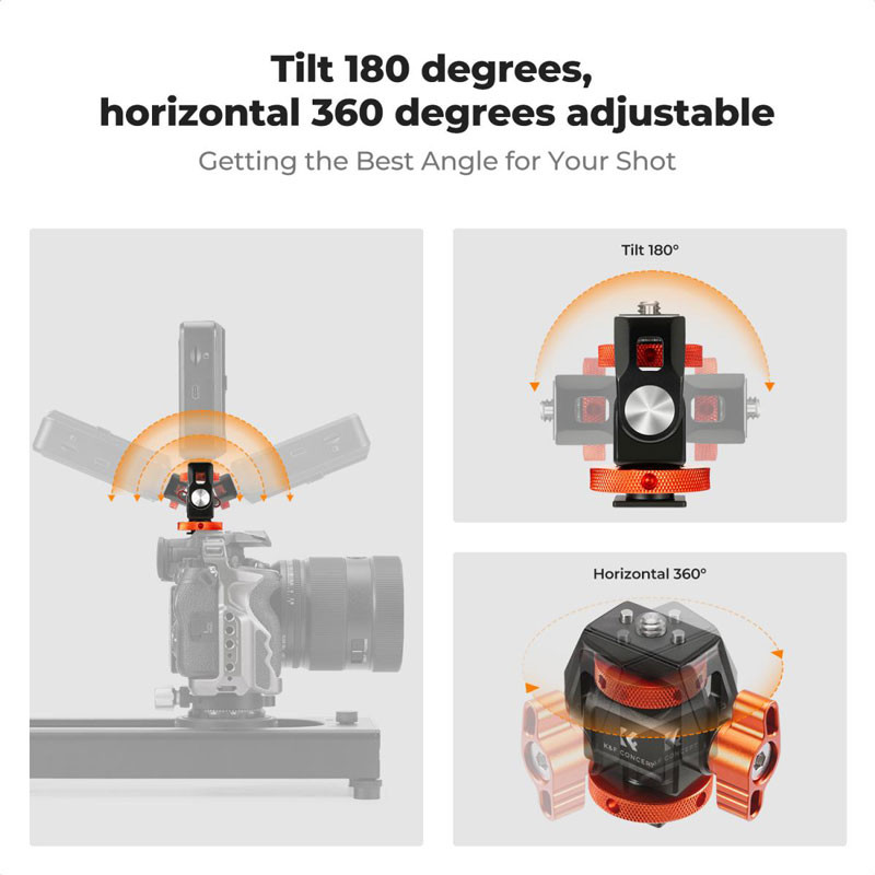 Támogatja a 180°-os dőlésszöget és a 360°-os vízszintes forgást többszöri szögbeállításhoz. Lehetővé teszi a kamera és a mobiltelefon szinkronizált felvételét, valamint kiegészítő fényforrások felszerelését is.