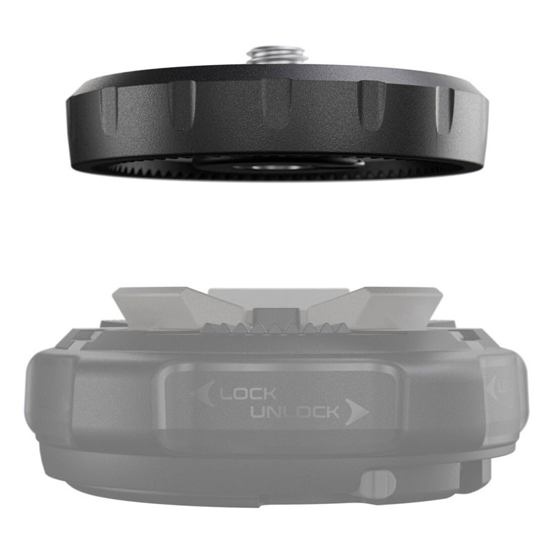 A Manfrotto XCHANGE lemez egy kompakt, kör alakú gyorskioldó lemez az XCHANGE rendszerhez, amely 3/8"-16-os felső csavaros rögzítéssel rendelkezik. Ez a lemez az XCHANGE alapra illeszkedik és a helyére rögzül, lehetővé téve a 360 fokos elforgatást.