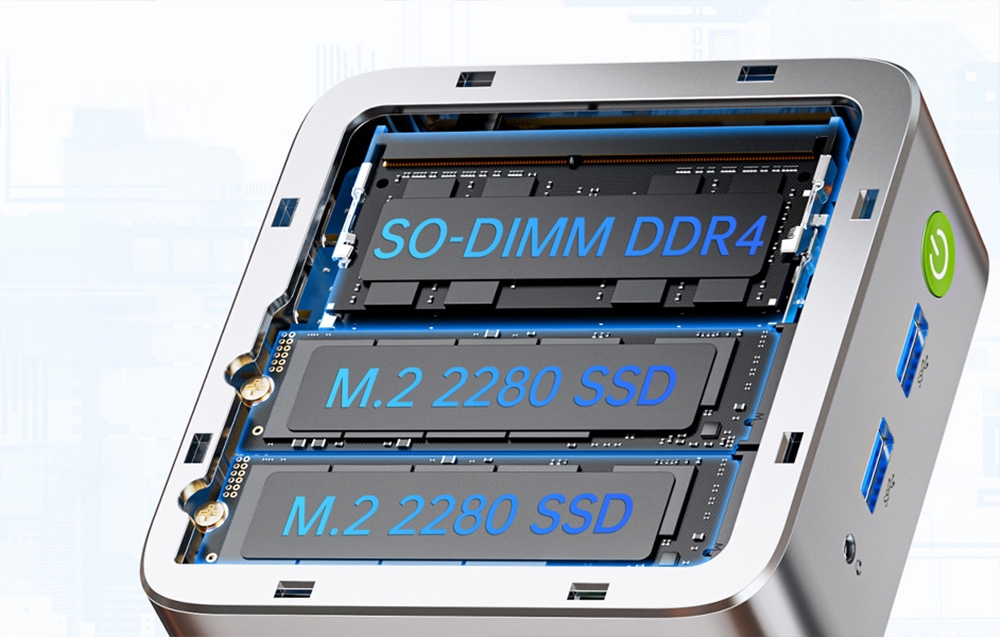 A MiniPC G10 16 GB RAM-ot (véletlen hozzáférésű memória/főmemória) kínál. Ez garantálja a szabadságot több alkalmazás egyidejű futtatásához és a nagyméretű fájlokkal való munkához. A beépített 512 GB-os M.2 2280 SSD villámgyors hozzáférést biztosít az adatokhoz, valamint gyors rendszer- és programindítási időt. Akár hatalmas médiatárakat archiválsz, akár 3D (háromdimenziós) projekteket készítesz, soha nem fogsz kifogyni a helyből.