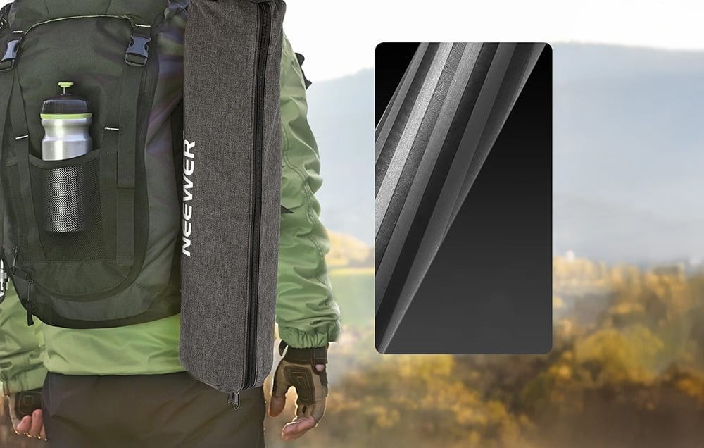 A nyolcrétegű szénszálas laminátumból készült Neewer N55C ellenáll a korróziónak és a szélsőséges körülményeknek. Erős felépítése ellenére könnyű és mobil marad - összecsukott állapotban az állvány mindössze 47 cm-es, és a mellékelt hordtáskában elfér, így könnyen szállítható és tárolható. Másrészt a teherbírása eléri a 12 kg-ot, így a legtöbb fényképezőgépet könnyedén megtartja. A minimalista, finom mintákkal díszített burkolat még érdekesebbé teszi.
