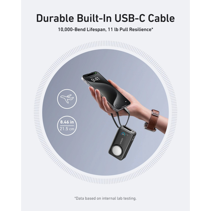 - Nagy teljesítményű kimenet: Akár 30W-os töltést biztosít az USB-C portján vagy a beépített, strapabíró USB-C kábelén keresztül, mellyel gyorsan feltöltheti iPhone-ját, iPadjét, vagy akár egy MacBook Air (M3) készüléket. Az iPhone 16 Pro 50%-ra tölthető mindössze 27 perc alatt.