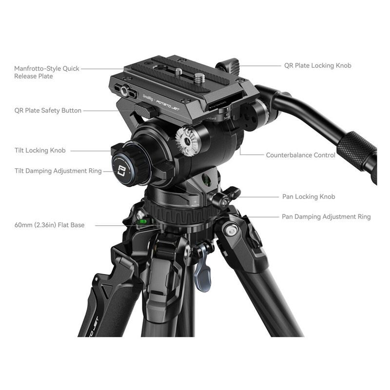 A folyadékfej lehetővé teszi a mellékelt Manfrotto-stílusú gyorskioldó lemez vagy egy DJI RS-stílusú gyorskioldó lemez használatát egy egyszerű érintés-és-menj kapcsoló megfordításával. A fej 360°-os pásztázásra és +90/-60°-os dőlésre képes, a gyorskioldó lemez pedig 1/4"-20 és 3/8”-16-os kameracsavarokkal rendelkezik, hogy minden kameratípushoz illeszkedjen. További jellemzők közé tartozik a buborékos vízszint, az 1/4"-20-as tartozékmenetek és a fej mindkét oldalára felszerelhető pásztázó rúd. Emellett levehető gumilábakkal és tüskés lábakkal is rendelkezik a különböző beállításokhoz való illeszkedéshez.