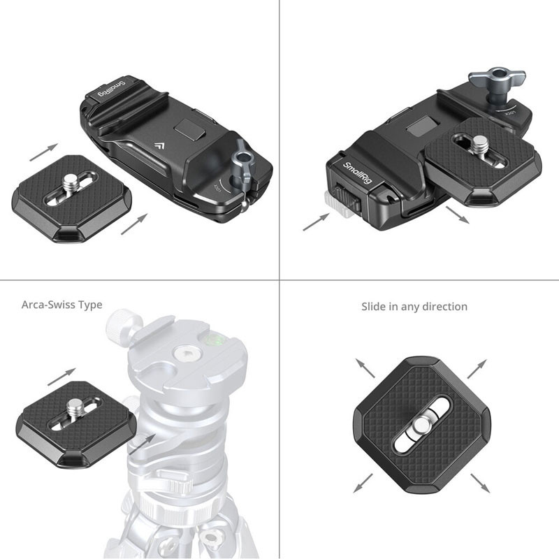 A SmallRig gyorskioldó rögzítőlemezzel ellátott kamerakapocs a SmallRig egy robusztus, 40 kg-os függőleges terhelhetőségű kamerakapocs-rendszer, amely gyorsan rögzíti a DSLR, tükör nélküli vagy más típusú fényképezőgépeket hátizsákokon, pántokon vagy öveken. Beépít egy becsúsztatható automatikus reteszelő mechanizmust, amely egyfunkciós kioldással rendelkezik, és nem fogja lelassítani Önt. A mellékelt Arca-típusú gyorskioldó lemez négyzet alakú, ergonomikusan lekerekített sarkokkal rendelkezik a gyors, minden irányú rögzítéshez. A csúszózár biztonsági gomb megakadályozza, hogy a bilincs véletlenül kioldja a felszerelt fényképezőgépet.