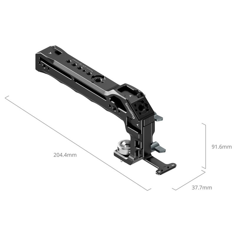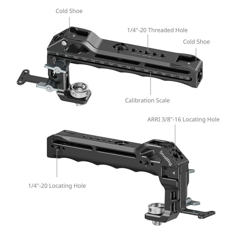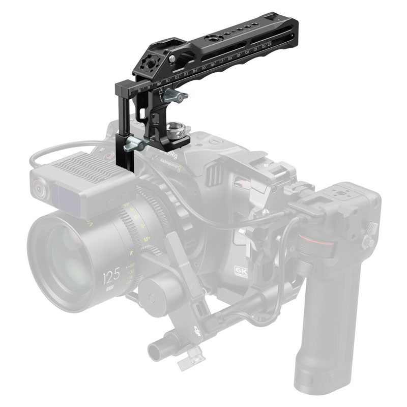 A SmallRig Top Handle segítségével hordozhatja kameráját vagy rigjét, és felszerelheti nyomkövető egységét. A fogantyú egy 3/8"-16-os ARRI-stílusú, csavarodásgátló menetre rögzíthető a kameraketrec vagy a rigre egy reteszelő csavar segítségével. A fogantyú tartalmaz egy elülső rögzítő konzolt is a DJI Focus Pro LiDAR modulhoz. A fogantyú markolata csúszó kialakítású, 23 cm-es mérőskálával rendelkezik, amely lehetővé teszi, hogy a LiDAR modult a kalibráláshoz optimális pozícióba helyezze.