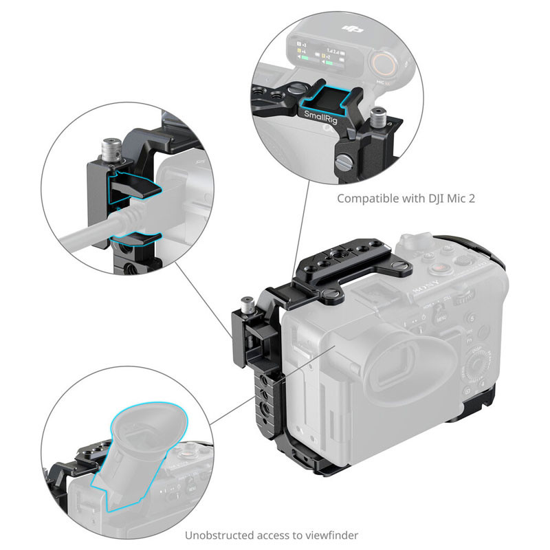 Ez a SmallRig kameraketrec a Sony FX2 védelmére és a rögzítési lehetőségek bővítésére szolgál, hogy egy olyan kézi kameraállványt hozzon létre, amely megfelel az Ön produkciójának. A ketrec egy NATO-sínnel ellátott levehető felső lemezzel rendelkezik, amelyre a Sony XLR felső fogantyú vagy más felső fogantyú rögzíthető anélkül, hogy az EVF-et zavarná. A ketrec további rögzítési pontjai közé tartozik egy másik NATO-sín, több 1/4"-20 és 3/6"-16 menet, egy vakupapucs csatlakozó és egy QD aljzat, amely a tartozékok széles választékának befogadására alkalmas. A beépített Arca-típusú gyorskioldó lemez lehetővé teszi a hatékony átmenetet a kézből tartott és a gimbal vagy állvány felvételkészítési konfigurációk között. A mellékelt HDMI-kábelbilincs gondoskodik a csatlakozások biztonságáról.