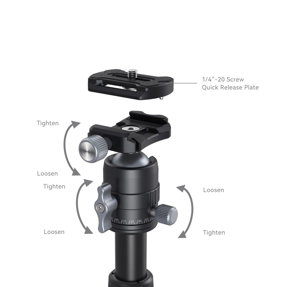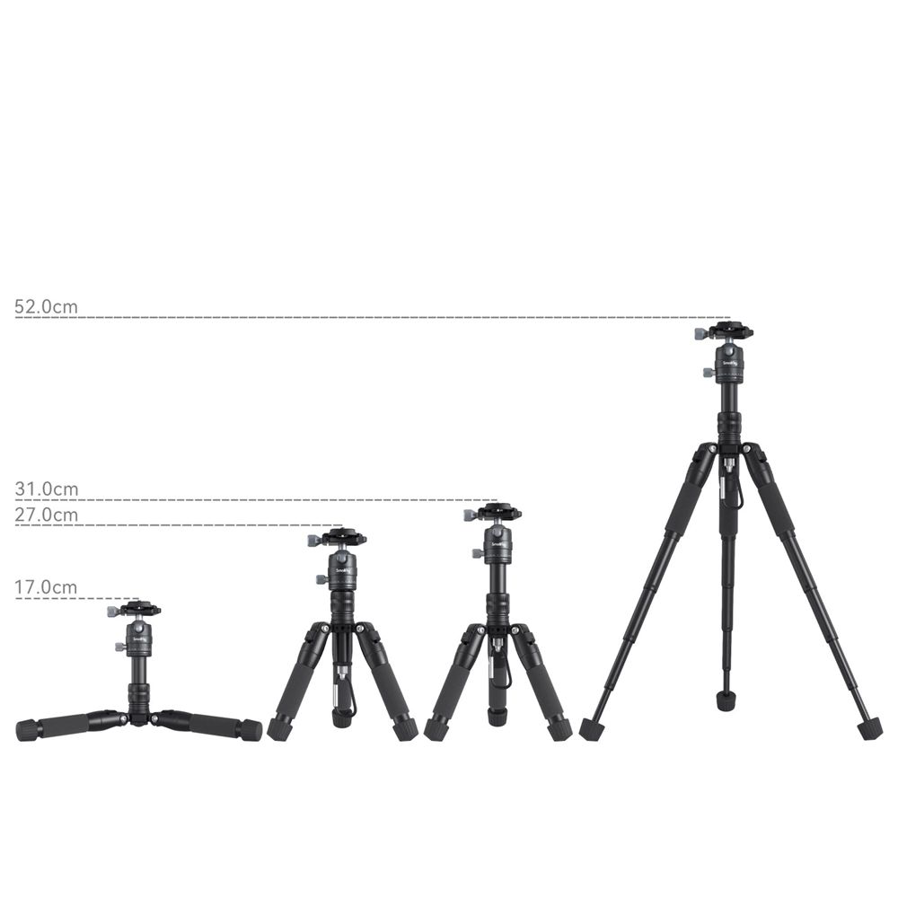 A SmallRig Aluminum Mini Tripod VT-20 4289 tökéletes miniállvány kompakt DSLR-ekhez, tükör nélküli kamerákhoz, okostelefonokhoz, akciókamerákhoz és egyéb eszközökhöz. Az öt szekciós, gyorsan meghúzható lábak akár 52 cm-re is kiterjesztik az állványt, és akár 6 kg terhelést is elbírnak. Összecsukott hossza mindössze 18 cm, és nagyobb fényképezési stabilitást biztosít az összecsukható alumíniumötvözet lábaknak és a középoszlopos kialakításnak köszönhetően. A három ütközőpont közötti (23°/50°/80°) gyors szögbeállításhoz rögzítőgombbal rendelkezik, a tetején pedig egy Arca-Swiss gyorskioldó panorámagömbfej található, amely 360°-ban elforgatható és 90°-ban dönthető függőleges fényképezéshez. 1/4"-20 menetes csatlakozásokkal is rendelkezik a Magic Arm-hoz, amelyre mikrofon, monitor, képátviteli rendszer, stb. rögzíthető.