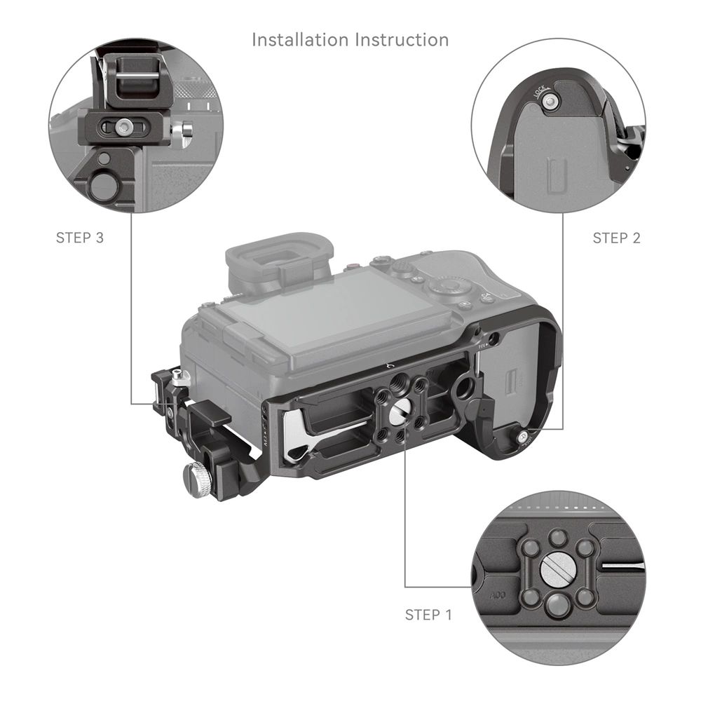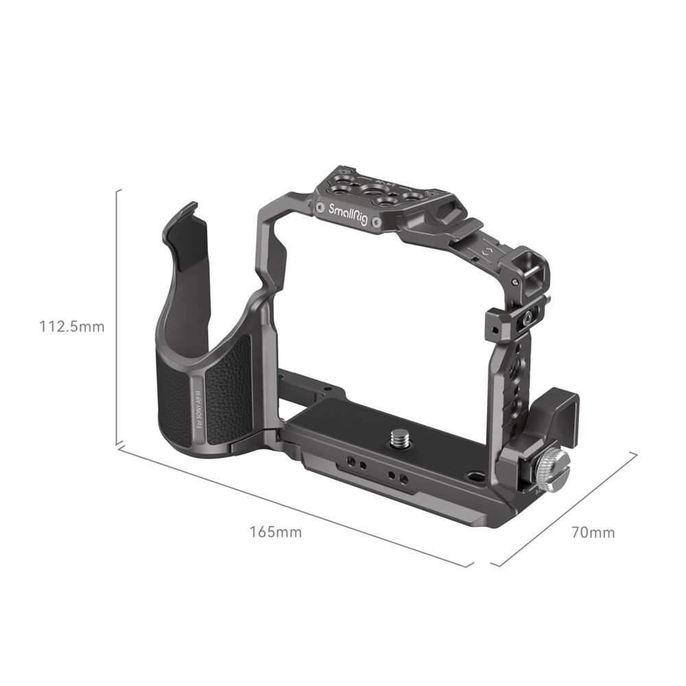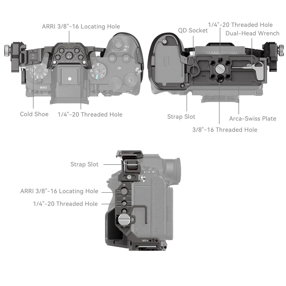 A SmallRig Cage for Sony Alpha 9 III 4533 a kamera védelmére és tartozékokkal való bővítésére lett tervezve. A hárompontos elhajlásgátló reteszelőrendszer szilárdan rögzíti az Alpha 9 III-at a rögzítőcsapokkal, az alján egy 1/4"-20-as csavarral, a bal oldalon pedig egy M2.5-ös csavarral. Az áramvonalas cage kialakítása biztosítja a gombok akadálytalan elérését, így kényelmesebb a használati élmény. A dedikált "Rhinoceros" HDMI kábelbilincs hüvelykujjcsavarokkal rögzíti a kábeleket, védi a HDMI portokat és biztosítja a stabil adatátvitelt. Több beépített rögzítési interfészt tartalmaz, köztük 1/4"-20 furatokat, ARRI 3/8"-16 rögzítőlyukakat, vakupapucsot, QD foglalatot, és pántnyílásokat a bal oldalon és alul. Az alján található beépített Arca-Swiss gyorskioldó lemez kompatibilis a DJI RS 2 / RS 3 / RS 3 Pro, RSC / RSC 2 gyorskioldó lapokkal ellátott stabilizátorral és az Arca-Swiss quick-release plate 3154-gyel.. Ezenkívül az alján található mágneses kulcs bármikor elérhető a könnyű szét- és összeszerelés érdekében.