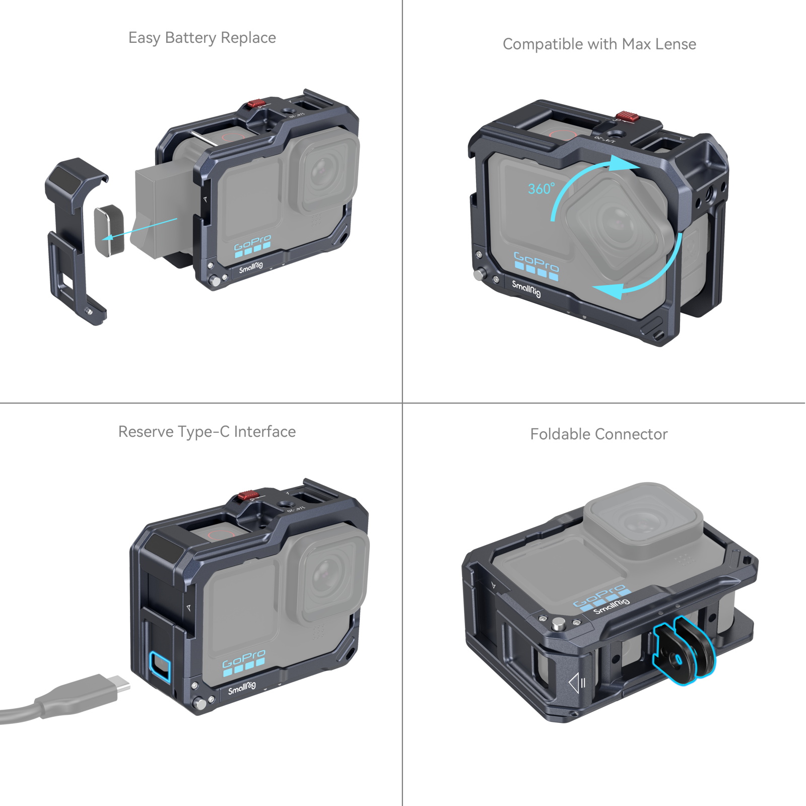 A SmallRig Cage for GoPro Hero 12/ 11 / 10 / 9 Black 3084C a kamera védelmére és a tartozékok rögzítésére szolgál. A cage olyan jól illeszkedik a kamerához, hogy nem takarja el a képernyőt, a gombokat és az USB-C portot. A burkolat megnyomásával gyorsan lezárható és a gomb megnyomásával kioldható, felül és jobb oldalon két vakupapucs található, amelyek kompatibilisek mikrofonnal és LED videolámpával. Üreges faragott kialakításuk nem blokkolja a GPS-jelet. Alul van egy GoPro tartó és egy 1/4"-20 menetes furat. Az oldallap a fedél megnyomásával gyorsan zárható és az akkumulátorkapcsoló gombjának megnyomásával elengedhető, és hozzáférést biztosít a Type-C porthoz; mágneses EVA-val rendelkezik, amely könnyen felszerelhető vagy eltávolítható. A kamera jobb védelme érdekében az oldallapot a helyén tarthatja anélkül, hogy szétszerelné az eredetit.