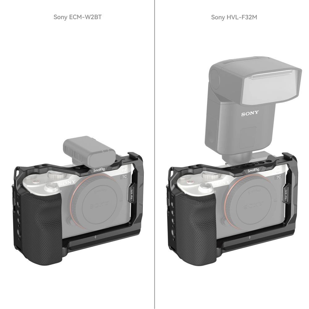 A SmallRig Cage with Side Handle for Sony Alpha 7C Camera 3212B úgy lett tervezve, hogy rögzítési pontokat biztosítson olyan tartozékokhoz, mint monitorok, mikrofonok és LED-lámpák professzionális videózás során. Beépített szilikonfogantyúval rendelkezik, amely ergonomikus kialakítású, hogy javítsa a fogási élményt. A cage alján egy 1/4"-20-as csavarral rögzíthető a kamerához. A további csavarodás elkerülése érdekében használhatja a jobb oldali zárat is a csúszka felnyomásával, és rögzítse a mellékelt kis csavart a kamera hevedernyílásához. A cage több 1/4"-20 menetes, és ARRI 3/8"-16 rögzítőfurattal rendelkezik, lehetővé téve 2165-ös Top Handle, 2879-es Cold Shoe Extension és BUT2664-es Tripod rögzítését vlog videózáshoz; a felső beépített vakupapucs illik mikrofonokhoz, LED-es lámpákhoz; az alsó beépített Arca típusú gyorskioldó lemez pedig a DJI RS 2 / RSC 2 / RS 3 / RS 3 Pro gimbalokhoz, így gyorsan válthat a kézi és a stabilizátoros fényképezés között. Ezenkívül a cage alján egy beépített mágneses csavarhúzó található a könnyű használat érdekében. A cage zökkenőmentesen illeszkedik a kamerához, anélkül, hogy blokkolná az akkumulátor fedelét, a képernyőt, a kártyanyílást és a gombokat. Teljes mértékben megőrzi a kamera eredeti funkcióit.