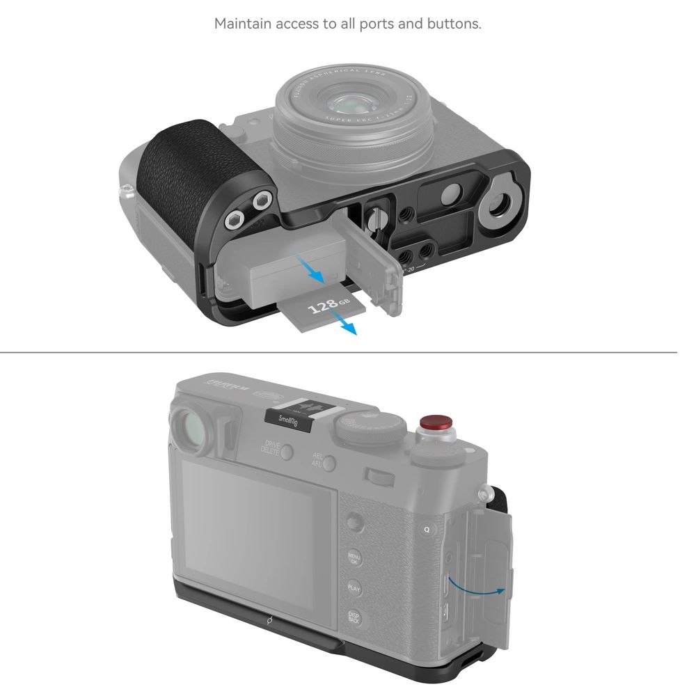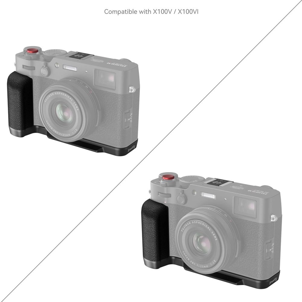 A SmallRig L-Shape Grip for FUJIFILM X100VI / X100V (Black) 4556-ot a kamerafogás javítására tervezték. Az L-alakú markolat alul egy 1/4"-20 csavarral rögzíthető a kamerára, a beépített szilikon párnák pedig megakadályozzák a karcolódást. Textúrája és színe tökéletesen passzol a FUJIFILM X100VI-hoz és X100V-höz. A beépített Az Arca-Swiss gyorskioldó alaplemez lehetővé teszi Arca típusú állványok egyszerű és gyors össze- és szétszerelését. Négy 1/4"-20 menetes furat található alul Manfrotto típusú lemezek és állványok rögzítéséhez továbbá pántnyílás csuklópánthoz (3848). Az alján beépített lapos csavarkulcs található a tartozékok egyszerű össze- és szétszereléséhez. A markolathoz tartozik egy „FUJIFILM” hanghullámot és az alapítás évét ábrázoló nyomattal ellátott vakupapucsfedél a FUJIFILM előtti tisztelgésként. Exponálógomb-sapkával is rendelkezik, amely puha és kellemes tapintású.