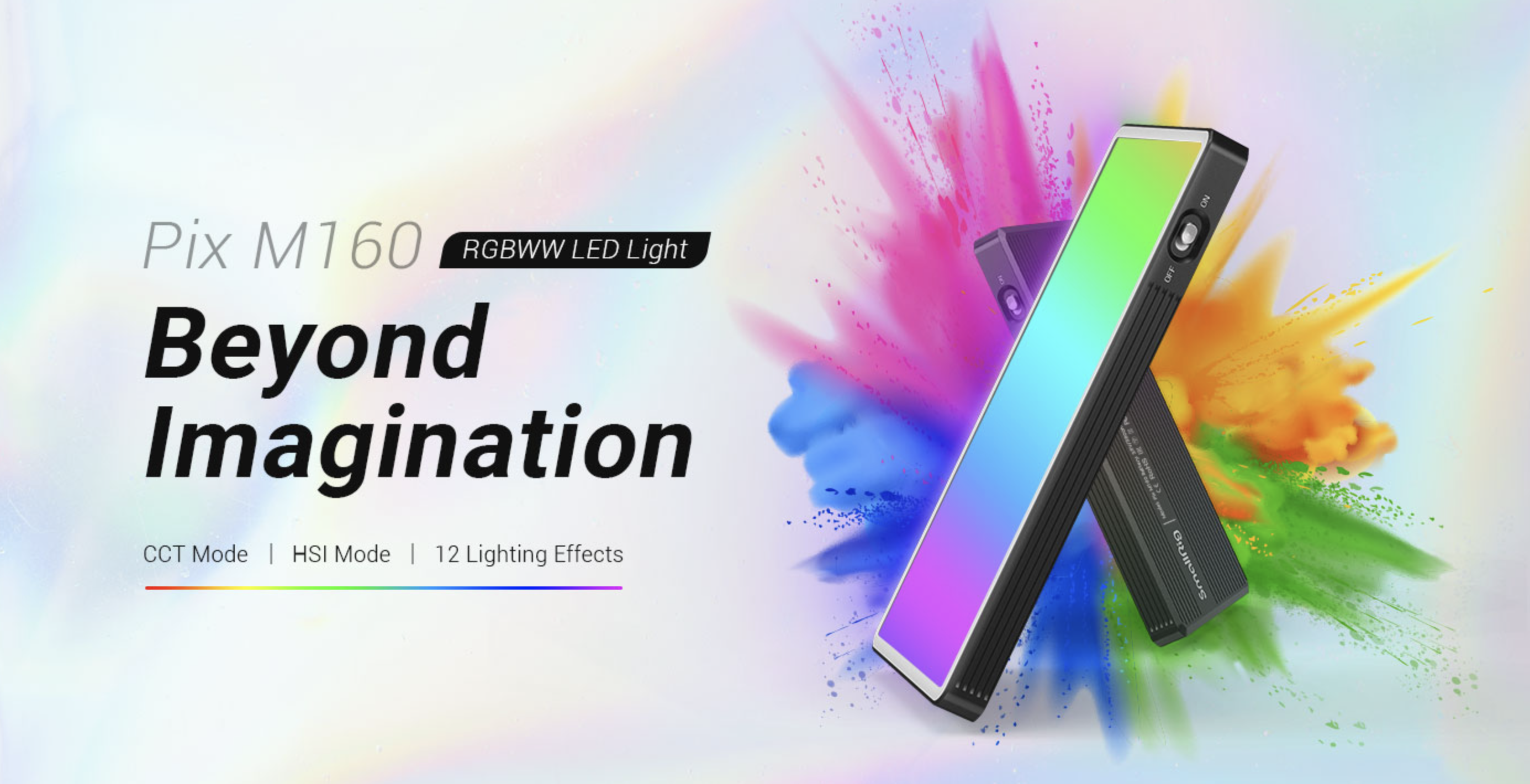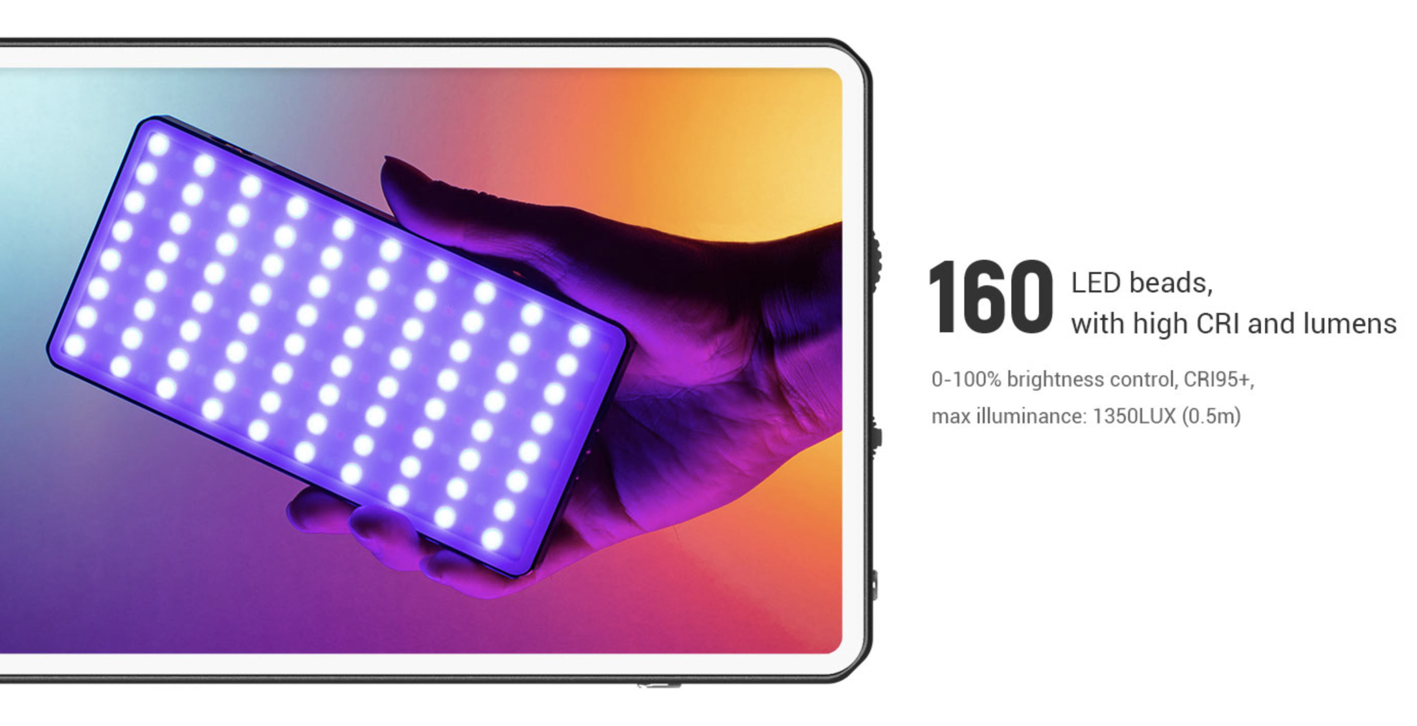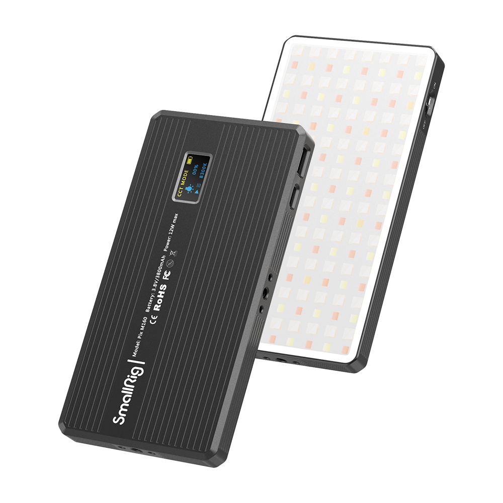 A SmallRig Pix M160 RGBWW LED lámpa szilárd, hordozható és többfunkciós, 0-100%-os fényerő-szabályozással, CRI95, TLCI98 színhőmérséklet-skálával 2500K-tól 8500K-ig, 360°-os színárnyalattal, 100 telítettségi fokozattal és tizenkét fényeffektussal. Beépített OLED kijelzővel a paraméterek megtekintéséhez, tekerőgombokon és gombokon keresztül történő vezérléséhez. Beépített 3800 mAh kapacitású lítium akkumulátorral érkezik, amely egy csatlakoztatott USB Type-C töltőkábellel tölthető, és powerbankként szolgál, amely egy beépített USB-porton keresztül tölti a telefont kikapcsolt állapotban. A lámpa mágnesesen rögzíthető, vagy közvetlenül kamerára vagy cagere szerelhető a 761-es gömbfejjel és beépített 1/4" -20-as csavarodásgátló furattal. Különféle atmoszférákat is létrehozhat a mellékelt méhsejtrács, illetve fénydiffúzor segítségével.