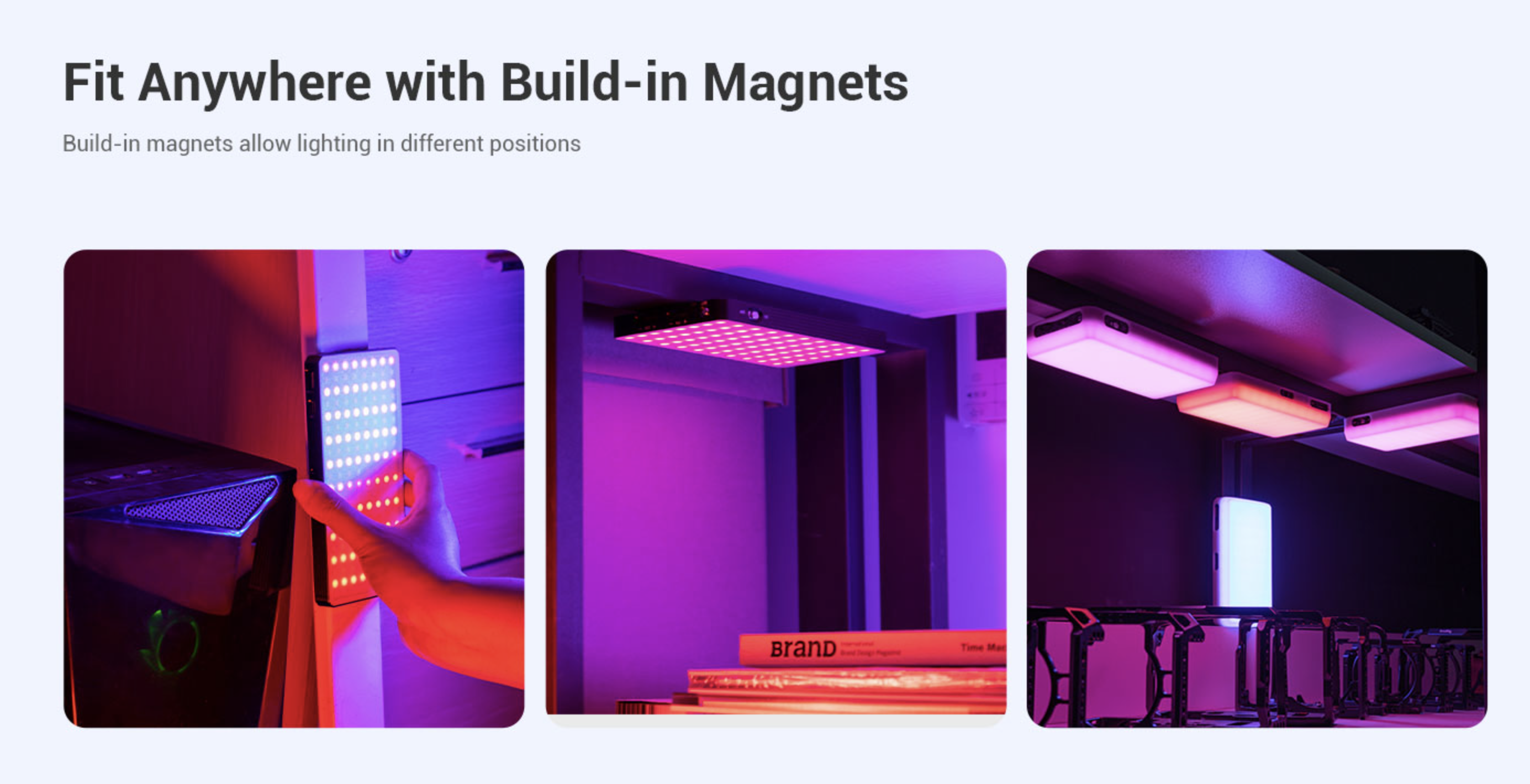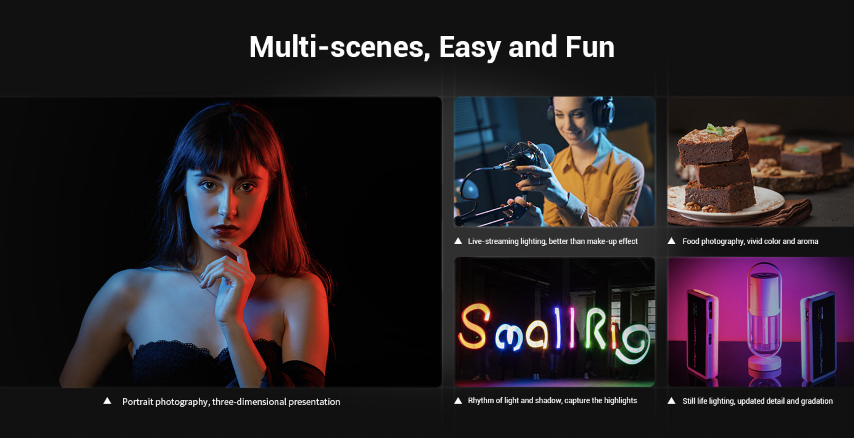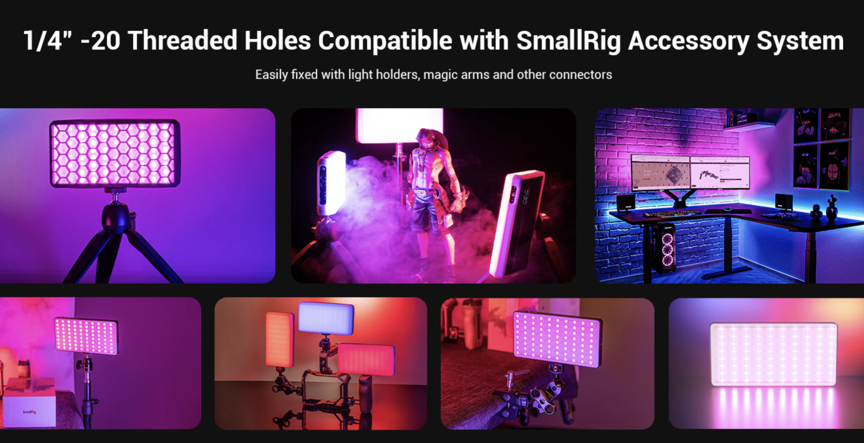 A SmallRig Pix M160 RGBWW LED lámpa szilárd, hordozható és többfunkciós, 0-100%-os fényerő-szabályozással, CRI95, TLCI98 színhőmérséklet-skálával 2500K-tól 8500K-ig, 360°-os színárnyalattal, 100 telítettségi fokozattal és tizenkét fényeffektussal. Beépített OLED kijelzővel a paraméterek megtekintéséhez, tekerőgombokon és gombokon keresztül történő vezérléséhez. Beépített 3800 mAh kapacitású lítium akkumulátorral érkezik, amely egy csatlakoztatott USB Type-C töltőkábellel tölthető, és powerbankként szolgál, amely egy beépített USB-porton keresztül tölti a telefont kikapcsolt állapotban. A lámpa mágnesesen rögzíthető, vagy közvetlenül kamerára vagy cagere szerelhető a 761-es gömbfejjel és beépített 1/4" -20-as csavarodásgátló furattal. Különféle atmoszférákat is létrehozhat a mellékelt méhsejtrács, illetve fénydiffúzor segítségével.