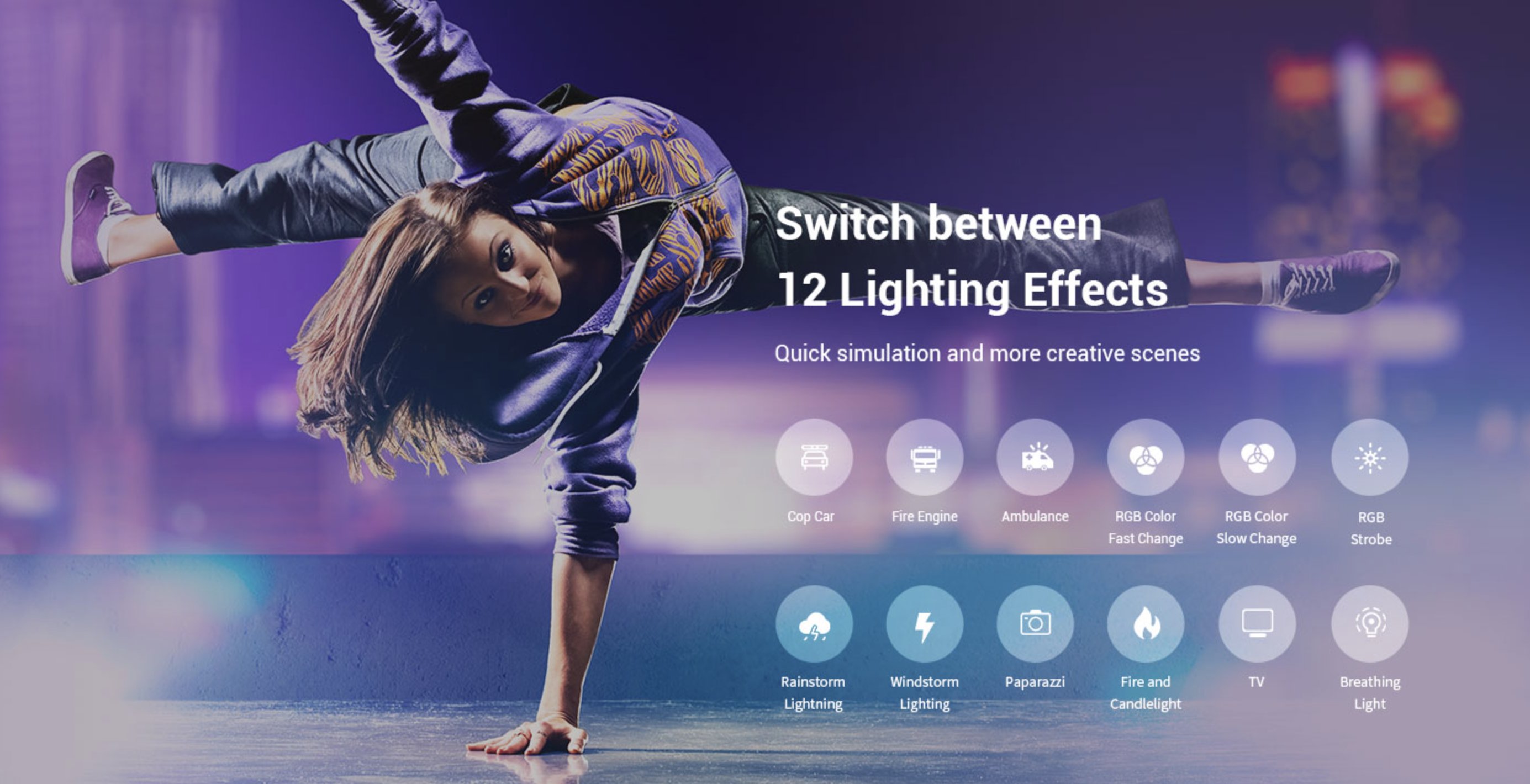 3. Tizenkét fényeffektus: rendőrautó fény / tűzoltóautó világítás / mentőfény / RGB szín (gyors) / RGB szín (lassú) / RGB Stroboflash / világítás 1 / világítás 2 / paparazzo / gyertyafény / képernyő fény / lélegző fény
