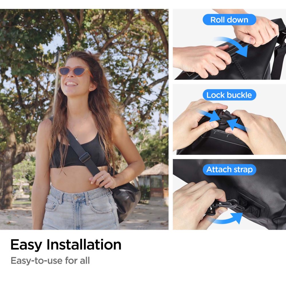 - Egyszerű és gyors zárási mechanizmus (Roll down, Lock buckle, Attach strap)