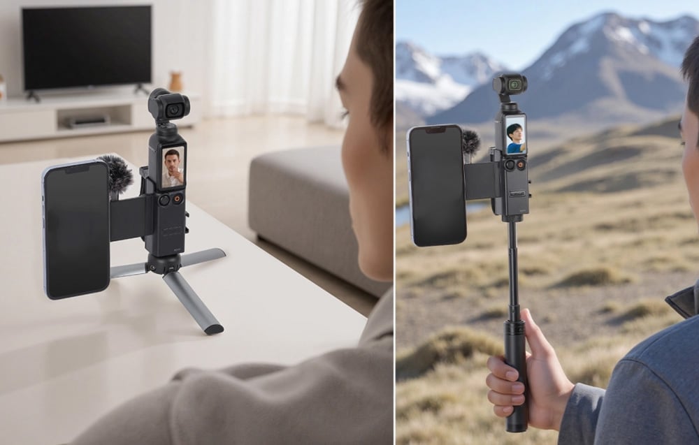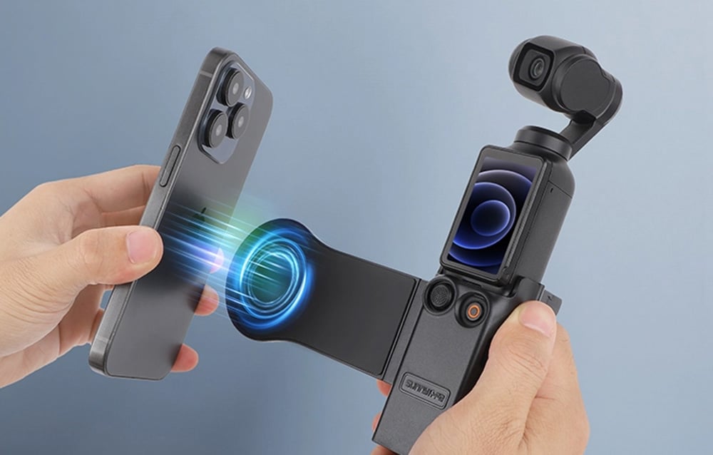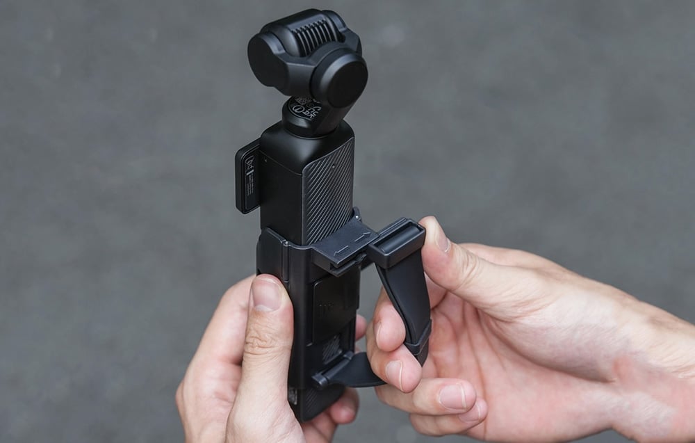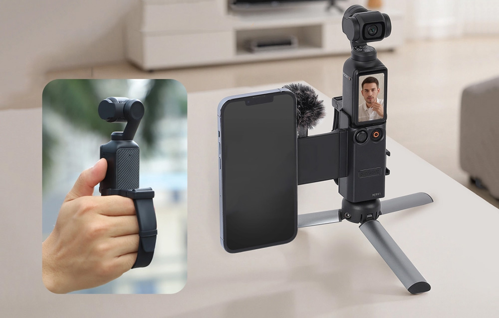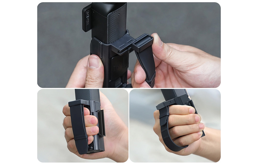 A kiegészítő könnyen kezelhető, gyorskioldóval rendelkezik, a mágneses tartó pedig biztonságos rögzítést biztosít. Kényelmes hosszabbító fogantyúként is funkcionál, amely javítja a Pocket 3 tartásának ergonómiáját. A hidegcipő-csatlakozó lehetőséget ad mikrofon vagy LED lámpa csatlakoztatására, a súgógép funkció segíti az élő közvetítések készítését. Az 1/4"-es menetes rögzítés és akkumulátoros markolat kompatibilitás új kreatív megoldásokat kínál. A precíz kivágások és puha párnák megvédik a Pocket 3-at a sérülésektől.
