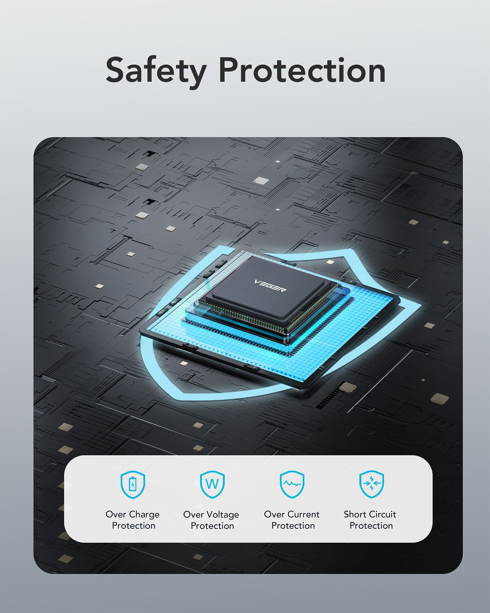 A Veger L20S powerbank beépített többszörös védelmi funkciókkal rendelkezik, amelyek garantálják mind az eszköz, mind a töltött készülékek biztonságát. Ezek közé tartozik a túltöltés elleni védelem, a túlfeszültség elleni védelem, a túláram elleni védelem és a rövidzárlat elleni védelem. Így teljes nyugalommal töltheti eszközeit.
