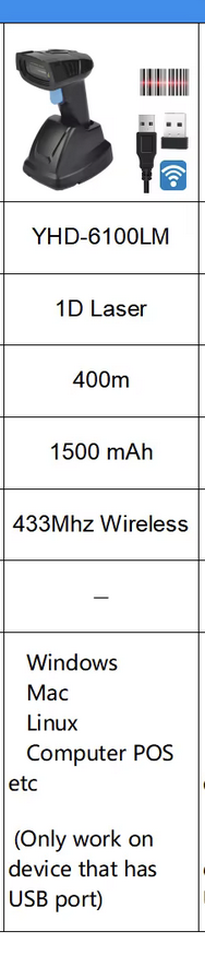 - Vezeték nélküli vonalkódolvasó (YHD-6100LM) - 1 db