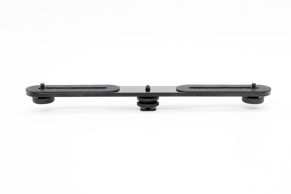 A szett része egy konzol, mellyel a fényképezőgép vakupapucsába illeszthető a sín.